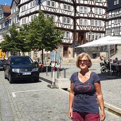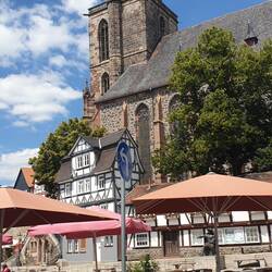 Homberg (Efze), sowie Schwalmstadt in der anderen Richtung vom Silbersee und noch viele weitere schöne Städte sind Teil der Deutschen Fachwerkstraße und liegen im sogenannten Rotkäppchenland. Unterhalb von Homburg fließt der Fluss Efze und gibt der Stadt ihren Beinamen. Hoch über der Stadt thront die Hohenburg! Von dort oben hat man nach Aussage unseres Stellplatzbetreibers einen tollen Blick über das ganze Chattenland. Mit dem verliehenen Titel „Reformationsstadt“ steht die Stadtt in gleicher Reihe mit den schon etablierten Reformationsstädten Wittenberg und Eisenach. Auf dem Burgberg kann man in den tiefsten ausgemauerten Basaltbrunnen Europas (150 Meter) schauen. Aber bei der Hitze den anstrengenden Weg hoch zur Burg zu machen, dazu verspürt kaum jemand Lust. Viel lieber überlegt man sich beim Eis und im Schatten des Sonnenschirms die Zahlen für den gemeinsamen Lottoschein, der sogar am Ort neben der Eisdiele abgegeben werden kann. Trotzdem unternehme ich noch mit Lisa einen kleinen Bummel durch die Altstadtstraßen, zu dem sich später auch Heidi gesellt. Die Stadtkirche können wir allerdings nicht besichtigen.