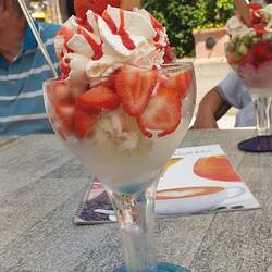 Die Altstadt von Homburg überrascht die Löhner wenig später. Kannten die meisten die Stadt nur vom Namen auf den Hinweisschildern der A 7, staunten alle nicht schlecht beim Anblick der hübschen und intakten Fachwerkhäuser. Und während man noch über den Standort der verabredeten Eisdiele diskutiert, hält ein Autofahrer und gibt den Tipp mit der Eisdiele in der Mauer unter der Kirche auf dem Markt. Wenn das nicht nett ist. Diese Eisdiele hatte am Abend zu vor auch der Stellplatzbetreiber empfohlen. Brigitte wird über den Wechsel des Treffpunktes informiert. Die nun nur noch neun Löhner suchen sich einen Platz unter den Sonnenschirmen auf dem Markt. Wenig später kommt nicht nur Brigitte dazu, sondern es werden auch die ersten tollen Eisbecher zum "Cool-Down" bei der Hitze serviert.