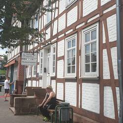 Das Zechentor erinnert an den einstigen Braunkohlebergbau in und um Frielendorf. Bis in die 1960er Jahre, waren Braunkohlebergbau und Brikettherstellung die wirtschaftliche Basis des Orts und der umliegenden Dörfer. Frielendorf gehörte zu den bedeutendsten Braunkohlerevieren Hessens, und die Tagebaugruben prägten die Landschaft. Im Dorf selbst befand sich eine Brikettfabrik. Der heutige Ferienpark war früher übrigens ein Braunkohlentagebau. Im Ort mit seinen Fachwerkhäusern herrscht Masken geschützte samstägliche Geschäftigkeit . Leider ist der Museumsladen , das Heimatmuseum geschlossen. Dort findet man viele Zeugnisse der Heimatsgeschichte und ein maßstabsgerechtes Modell der alten Zeche. Der Ortskern ist geprägt durch Fachwerkhäuser und den Bachlauf der Ohe. Wenn man die Hauptstraße entlang geht, entdeckt man auch historische Gebäude, wie die alte Türmchenschule gegenüber dem Rathaus. Ein Spaziergang durch Frielendorf ist auch ein Weg durch die Geschichte. Das Wetter ist inzwischen sonnig und warm geworden und wir suchen eine Möglichkeit einzukehren. Vor der Pizzeria, die uns vor zwei Tagen mit Pizza beliefert hat, können wir einen Cappuccino trinken, bevor es entlang der Landstraße wieder zurück zum Stellplatz geht.
