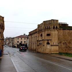 Ein Fußweg entlang des Flusses führt vom Hafen zur "Centre Ville", der Altstadt. Dort blühen schon die Magnolien. Ich komme direkt zur "Grand Rue," die Hauptstraße mit den historischen Arkaden und denke, die Bögen enden niemals . Es sind insgesamt 157 Bögen und der Bogengang mit den vielen kleinen Läden , Bars, und Geschäften ist fast 500 m lang. Überall wird an den alten Häusern gearbeitet. Manche sehen aus, als könnte der nächste Windstoß sie aus der Häuserreihe fallen lassen. Hier gibt es noch viel Handlungsbedarf, damit die Arkaden aus dem 15. Jahrhundert nicht ganz dem Verfall preisgegeben werden. In Deutschland wären sicher mehr als eines dieser Häuser wegen Einsturzgefahr gesperrt worden, die hier noch voll bewohnt oder als Läden genutzt werden. Aber wir sind ja auch nicht in Deutschland. Übrigens verdankt die Stadt ihre Bögen, die als Sehenswürdigkeit der Stadt beworben werden, der spanischen Besetzung im 15. Jahrhundert.