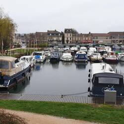 Von der Autobahn bis nach Louhans sind es noch 17 km durch die schöne Landschaft der Bresse - Bourgignonne , einem Landstrich im Burgund. Unser heutiges Etappenziel gehört zu dem Verbund von kleineren Städten und Orten, die sich unter dem Label: "Die schönsten Umwege Frankreichs", zusammengetan haben. Wir durchfahren eine typische französische Kleinstadt und werden vom Navi in den Hafen gelotst. Einige Hausboote sowie ein Boot der blauen Flotte dümpeln malerisch im Wasser der" la Seille", die ziemlich Hochwasser führt. Auf dem schön angelegten Stellplatz direkt am Fluss stehen nur 2 Mobile. Wir steigen aus und schauen ,wie wir das Wohnmobil am Besten stellen. Die Plätze sind zu kurz um angehängt stehen bleiben zu können. Wir koppeln ab und suchen uns einen schönen Platz am Rand. Der Platz kostet 4 Euro. Strom gibt es nicht. Aber dafür freies Internet. Wir sind begeistert. Der im Sonnenlicht liegende Fluss mit den Booten und die Stadt mit dem Kirchturm der St. Peter Kirche im Hintergrund sehen ganz romantisch aus. Am Ufer stehen Picknickgarnituren. Es ist zwar nicht sehr warm, aber mit einem Tee in der Sonne dort zu sitzen, ist eine Abwechslung, die ich nach dem gestrigen Regentag sehr genieße.
