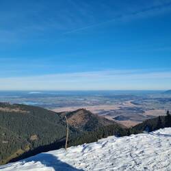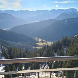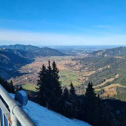 Gerade als ich mir das Gebäude anschaue, kommt eine Gondel herunter geschwebt. Wenn das kein Zeichen ist. Und bevor ich mich vergucke, schwebt die Gondel mit mir den Berg hinauf. Mit der Königscard, die wir von unserem Vermieter bekommen haben, ist dieses spontane Abenteuer kostenlos. Der Ausblick auf Oberammergau ist fantastisch, allerdings so ganz allein in der Gondel ist es schon komisch, besonders als sie in der Mittelstation einige Zeit stehen bleibt. Ich freue mich über die verschneite Landschaft. Oben auf der Bergstation ist so gut wie nichts los. Ein paar Gäste im Café, zwei Frauen kurz auf der Aussichtsterrasse, ansonsten gehört mir der Schnee und die phänomenale Aussicht fast allein. Die Sonne scheint und ich kann tief unten den Starnberger-, Staffel-, Rieg- und- Ammersee sehen. Welch ein schönes Erlebnis hat mir meine Spontanität da beschert. Nach einer guten Stunde habe ich nicht nur kalte Hände, sondern der Schnee hat auch meine Walkingschuhe völlig durchnässt und mir kalte Füße beschert. Zeit für die Rückfahrt.