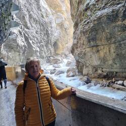 Die Klamm, wurde bereits im Jahr 1912 touristisch erschlossen und zum Naturdenkmal ernannt. Jedes Jahr besuchen über 300 000 Menschen diesen Ort. Da haben wir mal wieder Glück das ganz wenig los ist und wir auf dem Hinweg fast ganz allein durchgehen können. Auf dem Rückweg kommt uns schon die eine oder andere kleine Gruppe entgegen. Da heißt es dann, Nische suchen, Rücken an den Fels drücken und die Entgegenkommenden passieren lassen. Die Partnachklamm hat eine Länge von 699 Metern und eine Tiefe von circa 80 Metern. Am Ende der Klamm kann man einen der weitläufigen Wanderwege nehmen oder wieder durch die Klamm zurückgehen. Da Tristan und Lena bereits um 13.00 Uhr eine Trainerstunde oben auf der Skipiste gebucht haben, entscheiden wir uns für den zeitlich günstigeren Rückweg durch die Klamm. Auf dem Rückweg zum Auto kommen uns Heerscharen von Menschen entgegen, die in die Skiarena wollen. Das Skispringen beginnt in einer knappen Stunde.