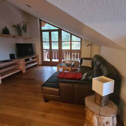 Die Ferienwohnungen sind wirklich vom Feinsten und ganz liebevoll eingerichtet. Wir hatten uns im Vorfeld schon für das "Zirbennest" ganz unter dem Dach entschieden. Von den beiden Balkonen haben wir eine herrliche Sicht auf den Koferl und auf die Piste. Da liegt wirklich noch Schnee und die Lifte fahren.