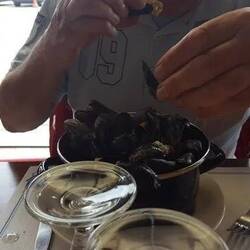 Nach einer Verschnaufpause für den Fahrer geht es auf zum Stadtbummel. Schließlich sind wir nicht umsonst hier. Der Himmel ist wolkenlos und die Sonne scheint, so sieht alles gleich viel hübscher aus. Nicht weit vom Stellplatz steht ein Riesenrad. Eine Fahrt darin würde mich schon reizen, aber allein macht es keinen Spaß. Michael habe ich nur ein einziges Mal zu einer Riesenradfahrt überreden können. Das war in Wien und ist fast 50 Jahre her. Muss ja auch nicht sein und so beobachten wir lieber das bunte Treiben rund um das Hafenbecken. Es ist Mittagszeit und die vielen kleinen Lokale im Hafen sind reichlich gefüllt. Töpfe mit Muscheln stehen überall auf den Tischen, flankiert von Platten mit Pommes Frites und einem Roséwein oder einem Bier. Es macht Spaß, den Menschen dabei zuzusehen, mit welcher Gelassenheit sie das Muschelfleisch mit Hilfe der Schalen aus den Muscheln pflücken, während sich die Finger zwischendurch immer wieder eine Pommes Frites greifen. Die Stadt ist voller Leben, besonders zu den Essenszeiten.