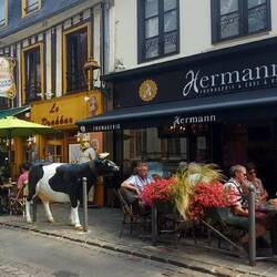 Das Publikum in Honfleur ist nicht mondän, sondern besteht aus Familien von nebenan. Die Spezialitätenläden entlang der Straßen wecken unseren Hunger, und so beschließen wir, eine Kleinigkeit zu essen.