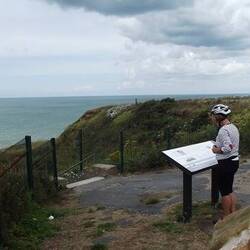In Tardinghen weist ein Schild auf einen Panoramablick hin, den wir selbstredend wahrnehmen. Er ist wunderschön. Unter uns die sattgrünen Wiesen, mit den grasenden Kühen und darunter das Blau der Nordsee und im Dunst dahinter kann man die Steilküste von Dover wahrnehmen. Für Wohnmobile ist der schöne Parkplatz an der Kirche leider ab März gesperrt. Am Parkplatz mit Ausblick entdecken wir einen kleineren Weg hinunter zum Strand, den wir fahren. Am Strand werden die Räder abgestellt und es geht zu Fuß weiter. Der dortige Parkplatz am Meer zeigt ebenfalls ein Womo-Verbotsschild.