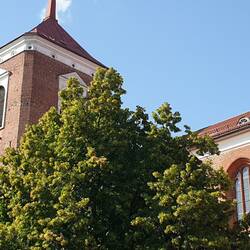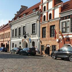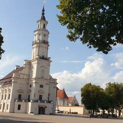 Es ist fast 15.00 Uhr als wir Kaunas, die zweit größte Stadt Litauens, erreichen. Schon von der Brücke, über die wir bis zur Ausfahrt fahren, sehen wir das Stadtcamping Kaunas unten am Fluss Neris liegen. Es ist wenig los, und wir können uns einen der extra langen Plätze für Gespanne aussuchen. Die Stellplätze sind super gemacht, wirken aber mit den Betonstreifen fürs Womo und den Rasengittersteinen insgesamt etwas unpersönlich. Strom gibt es an jedem Platz und auch Sanitär und Ver- und Entsorge ist vorhanden. Der Clou ist der kleine Pool mit den Liegen rundherum. Hier kann man sich nach einem heißen Stadtbesuch abkühlen. Das Wetter ist sonnig, so um 25 Grad. Deshalb nehme ich gleich nach der Ankunft mein Fahrrad und radele in die ca. 5 km entfernte Altstadt. Michael ist sichtlich geschafft von der Fahrt und will sich nur noch ausruhen. Die Stadt wäre morgen auch noch da, meint er. Die Strecke führt auf einem super Radweg zwischen Straße und Fluß entlang. Im weitern Verlauf führt der Weg in den Park, zur Burg und zum Zusammenfluß von Memel und Neris. Aber das weiß ich an diesem Nachmittag nocht nicht, und so verlasse ich den tollen Radweg, nicht ohne zwischendurch einmal an den Fluß gegangen zu sein, und schlage mich über holprige Straßen, Bürgersteige, hohe Bordsteinkanten und Fußgängerüberwege bis zur Vilniusstraße durch. Jene Hauptflaniermeile mit den vielen netten Bars, Cafés, Lädenund Restaurants, an deren Ende der Rathausplatz liegt, mit den geschichtsträchtigen Bauten, wie dem Dom zu Kaunas und der Kathedrale der Heiligen St. Peter und Paul. In der Kathedrale ist es schön kühl und ich bleibe einen Moment in der Bankreihe sitzen und schaue auf den wunderschönen Altar.Teile der Kathedrale sind eingerüstet und abgedeckt. Hier scheint man weitere Fresken frei zu legen, wie die, die ich schon einer der Wände bewundern kann. Auf dem Rathausplatz fällt mir ein prächtiges weißes Gebäude mit einem hohen Turm auf. Das muss das Rathaus der Stadt Kaunas sein, das die Einwohner liebevoll als "weißen Schwan" bezeichnen Wahrscheinlich wegen des Turmes, der sich einem ausgestreckten Schwanenhals gleich, in den Himmel reckt. Im Inneren befindet sich das Museum der Stadt und die Tourist- Information. Das gelbe mit weißen Stuckelementen verzierte Gebäude dahinter, ist der historische Präsidentenpalast der Stadt Litauen, in dessen Innenhof man die Skulpturen der ehemaligen Präsidenten sehen kann. Heute befindet sich im Palast ein Museum. Es gibt auch noch eine Fotogalerie, die in einem alten Backsteinhaus untergebracht ist.