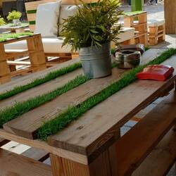 Womofriends-on-tourDen Namen wissen wir nicht mehr. Es ist aber nicht zu übersehen, wenn man die Vilniusstraße entlang schlendert. Palettenmöbel mit Kunstrasen.
