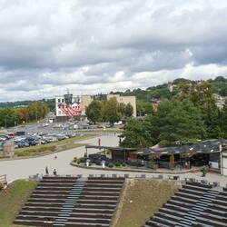 Er fängt schon in den frühen Morgenstunden an, der Regen. Er trommelt stetig aufs Wohnmobildach. Irgendwie ist das auch ganz gemütlich. Im Bett bleiben mit einer großen Tasse Kaffee. Lesen und ein wenig Fernsehen. Da wir den Regen gestern schon angekündigt bekommen haben, wird aus Plan A mit dem Rad in die Stadt zu fahren und zu bummeln, schnell Plan B gemacht: Vormittags in den großen Supermarkt, der keine 300 m entfernt ist zum Einkaufen, um letzte Mitbringsel zu besorgen. Dort in der Nähe muss auch das Sport Outlet der Fa. Hummel sein. Den Tipp haben wir leider erst bei der Abreise bekommen. Am Nachmittag wollen wir mit dem Bus in die Stadt fahren. Die Haltestelle ist direkt vor dem Eingang zum Campingplatz. Die Linie 47 fährt bis ins Zentrum "Kaunas Pillis", kostet pro Fahrt und Person einen Euro und der Bus fährt alle 20 Minunten. Bevor wir mit Schirm und Rucksack zum Supermarkt gehen, wird aber schnell noch ein Pflaumenkuchen gebacken. Auch für so etwas ist bei Regen Zeit. Gegen 14.00 Uhr werden aus dem Dauerregen einzelne Schauer und wir wagen es, ins Zentrum zu fahren. Dort gehen wir zunächst zur Burg, die in einem Park liegt. In der Spitze des Parks können wir den Zusammenfluß von Memel und Neris beobachten. Der rekonstruierte Teil der Burg beherbergt ein Museum, das wir uns vom Kerkerkeller bis zum Dachboden im Turm anschauen. Witzig sind im Keller die Multimedia - Effekte, wie z.B.der Ritter, der mit Laserstrahlen plötzlich an eine Wand projeziert wird.