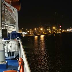 Um halb zwölf macht Michael mich wach und fragt, ob ich mit kommen möchte, um einen Kaffee zu trinken. Für Kaffee nach dem Wach werden bin ich immer zu haben, egal um welche Uhrzeit. Völlig allein sitzen wir beide dann im Salon beim Kaffee und schauen durchs Fenster auf das dunkle Wasser der Ostsee. Kurze Zeit später tauchen auch Chris und Gaby auf und setzen sich dazu. Sie haben ihre Sachen schon gepackt und mitgebracht. Eine halbe Stunde vorm Anlegen müssen die Kabinen geräumt und die Schlüsselkarten abgegeben werden. Das Packen hole ich dann auch nach und komme mit meinem Rucksack zurück zur Sitzecke. Michael soll seinen Rucksack selber aus der Kabine holen und dabei noch einmal schauen, ob nichts liegen geblieben ist. Da habe ich doch tatsächlich sein kleines Schmusekissen im Bett vergessen! Vier Augen sehen eben doch mehr als zwei. Wir unterhalten uns noch ein wenig, und dann tauchen auch schon die Lichter des Hafens von Travemünde auf. Ich gehe noch einen Moment an Deck und komme gerade rechtzeitig, um die Promenade und die beleuchteten Häuser vorbeiziehen zu sehen. Kurze Zeit später erfolgt auch schon der Aufruf, die Fahrzeuge aufzusuchen. Dort verabschieden wir uns zum definitiv letzten Mal auf dieser Reise von Chris und Gaby. Es war schön, die beiden kennengelernt zu haben. Sie waren tolle Reisebegleiter auf dieser Tour, und wir haben uns immer gefreut, wenn sie auf einem Stellplatz aufgetaucht sind oder schon da waren. Es hat jeder seine eigene Reise gemacht, und trotzdem haben sich unsere Wege immer wieder gekreuzt.