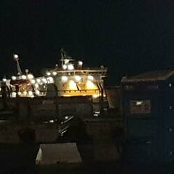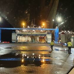 Dann ist es soweit, wir dürfen von Bord fahren und müssen uns einen Weg durch den dunklen Hafen suchen. Wir fahren einfach den LKWs hinterher und finden so aus dem Hafengelände heraus.