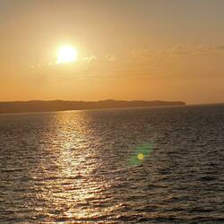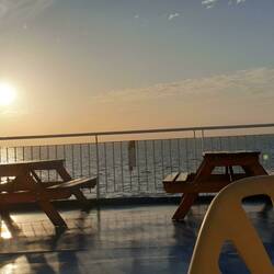 Nach dem Essen suche ich mir noch bis zum Sonnenuntergang eine windgeschützte Ecke zum Lesen und Schreiben. Zum Sonnenuntergang taucht Michael auch auf. Er hat mich schon auf dem ganzen Schiff gesucht. Nur hinter den Lüftungsklappen hatte er noch nicht geschaut. Es sind wenig Menschen an Deck. Die meisten sind nach dem Essen in den Kabinen verschwunden. Auch wir gehen in die Kabine. Eine heiße Dusche wärmt wieder auf. Es war zum Schluss ganz schön frisch an Deck. Dann krabbeln wir bis kurz vor Mitternacht in die Kojen, um ein wenig zu schlafen.