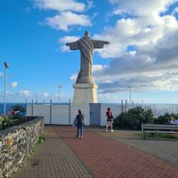 Ich komme mit dieser Zeitumstellung nicht klar. Die Uhr wurde bei unserer Ankunft eine Stunde zurückgedreht. So bin ich, ortszeitmäßig gesehen, sehr früh wach. Wie auch beim Wohnmobil ist für mich, den Tag in das Zimmer zu lassen, meine erste und liebste Tat. Der Tag ist aber noch nicht so weit und zeigt sich nur als gelber Streifen am Horizont. Aber auch sehr schön zum Ansehen. Aber als der Tag dann ausgeschlafen hat, ist er wunderschön, wolkenlos, sonnig, mit einem belebenden Lüftchen. Unser Frühstück können wir daher auf der Terrasse einnehmen, mit Blick auf den Atlantik. Ich muss mich wirklich mal kneifen, ob das alles echt ist. Gerade noch in Eis und Schnee und jetzt Frühstück in der Sonne. Unser Frühstück ist lecker und reichhaltig, und das Schönste ist: Keiner muss es dieses Mal machen. Der Plan für heute sieht eine Erkundung von Funchal mit dem Linienbus vor. Vor allem zum Mercato dos Lavradores möchte ich gern. Der Mercado dos Lavradores ist eine von 1939 bis 1940 erbaute Markthalle in Funchal, in der täglich Obst, Gemüse, Blumen und Fisch gehandelt werden. Sie steht unter Denkmalschutz und ist eine Touristenattraktion in der Altstadt, Zona Velha. Der Linienbus fährt genau gegenüber dem Hotel ab. Google Maps ist da ja echt hilfreich, was Abfahrtzeiten und Linienbezeichnungen sind. Nur haben sich Maps und der Fahrer der Linie 155 nicht auf eine gemeinsame Uhrzeit einigen können, und so fährt uns der Bus vor der Nase weg. Pech, denn der nächste Bus soll laut ausgehängtem Fahrplan erst wieder in einer Stunde fahren. Obwohl Maps behauptet, der nächste Bus käme in 20 Minuten, glauben wir es nicht und nehmen eines von den vor dem Hotel stehenden Taxen, um in die Stadt zu gelangen. Just als das Taxi mit uns startet.....kommt der angekündigte Bus. Scheint nicht unser Tag zu sein. Die Fahrt ist aber sehr schön, nicht so teuer, und der Fahrer setzt uns nicht nur direkt vor dem Markt ab, sondern erzählt uns auch noch so einiges über die Altstadt Zona Velha. Der Mercado dos Lavradores ist wirklich sehenswert. Der beeindruckende Eingangsbereich mit Azulejos, Fliesen, die typische Marktszenen zeigen, führt zu einem offenen Innenhof mit Ständen voller köstlicher Madeira-Spezialitäten. Im oberen Geschoss finden wir eine Vielzahl von Früchten, darunter Mangos, Papayas, Kiwis, Passionsfrüchte, Drachenfrüchte schwarze Bananen und viele Früchte, die wir gar nicht kennen. Beim nächsten Besuch nehmen wir von allen unbekannten Früchten ein Exemplar zur Verkostung mit. Besonders auffällig sind die knallroten Chilis, die von Hand aufgefädelt ein farbenfrohes Dach bilden. Am Freitag, also heute, und Samstagvormittag ist der Markt am schönsten, wenn der Innenhof mit regionalen Produkten von Bauern aus der Umgebung gefüllt ist. Wir können heute daher Marktfrauen in typischer roter Madeira-Tracht sehen. Auf dem Fischmarkt fallen viele lange, schwarze Fische auf, die typisch für Madeira sind. Sie kommen aus den Tiefen des Atlantiks und heißen auf Portugiesisch "Espada Preta", schwarzer Degenfisch. Es lohnt sich, die Preise an den einzelnen Ständen zu vergleichen. Diese unterscheiden sich teilweise doch erheblich voneinander. Das muss ich leider auch erfahren, als ich verschiedene getrocknete Obstsorten kaufen möchte und plötzlich für eine Tüte 68,00 Euro bezahlen soll, weil der KG-Preis angeblich bei 35 Euro liegt und ich 2 kg in der Tüte haben soll. Da gebe ich schnell, bis auf einen kleinen Rest, alles zurück. Und der ist noch teuer genug. Später sehen wir auch viele Obst- und Gemüsestände verteilt in der Stadt, die bessere Preise haben. Aber die Farbenpracht auf dem Markt ist schon toll. Vom Markt laufen wir in die Hauptstraße mit Läden und Lokalen und auf kleinen Nebenstraßen zur Promenade am Hafen. Dort liegt ein großes Kreuzfahrtschiff, dessen Passagiere gerade die Altstadt bevölkern. In einer kleinen Bar am Wasser machen wir eine Pause und dann geht es zum Teleferico, der Seilbahn, mit der wir morgen auf den "Monte" fahren wollen. Von dort aus fahren auch die Busse nach Caniçio ab. Bevor wir wieder einem hinterhersehen müssen, nehmen wir doch gleich den, der dort steht. In den nächsten 20 Minuten erleben wir eine aufregende Fahrt über die Küstenstraße mit vielen wunderschönen Ausblicken. Lohnt sich wirklich. Zurück am Hotel haben wir Kaffeedurst. Genau gegenüber finden wir ein Café, das sogar Kuchen hat. Wir sind angenehm überrascht, wie günstig das hier ist. Nie im Leben hätten wir in Deutschland für 6 Euro 2 Kaffee und 2 Stück Kuchen bekommen. Michael braucht anschließend seine Siesta, und ich mache mich währenddessen auf den Weg zur Christusfigur. Die Tageszeit ist gut gewählt. Die etwas tief stehende Sonne verzaubert die eh schon schöne Landschaft. Es geht steil bergab. Das erwähnte ich ja schon und an den Rückweg denke ich mal nicht. Jetzt hätte bald geschrieben "unten angekommen", denn das Gefühl hatte ich, als ich zunächst zur Seilbahnstation komme. Aber es geht noch viel weiter und steiler hinunter, will MSN an den Strand, der aus schwarzem Sand besteht. Man kann es laufen, macht aber keiner, wer hinunter will, zum Strand, nimmt für 4 Euro retour die Seilbahn oder Teleferico, wie es landessprachlich heißt. Man bezahlt gleich Retour, denn da hochlaufen will wirklich niemand. Da haben ja schon viele Autos ihr tun. Unten am Strand gibt es nicht nur einen Parkplatz, sondern auch eine Strandbar, von der man aus romantischen Sonnenuntergängen zu sehen bekommt. Werd' ich ein anderes Mal austesten. Heute fehlt mir dazu das Pendant. Aber ob ich Michael bei seiner Höhenangst in die Seilbahnen bekomme, bezweifle ich im Moment noch. Egal, heute ist erst einmal mein Date mit der Christusfigur dran. Auf einem wunderschön bepflanzten Weg mit tiefen Einblicken auf den Atlantik komme ich zur Statue, die mir aber nur ihr Hinterteil zeigt. Will man sie von vorne sehen, dann auf in den Kampf? Eine steile Treppe führt die