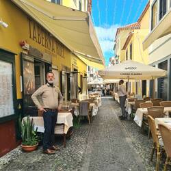 Am Strand dieser Stadt liegen die charakteristischen Fischerboote, die „Xavelhas“. Am Ortseingang ist noch die riesengroße Krippe vom Weihnachtsfest aufgebaut. Weihnachten und Silvester sind auf Madeira von ganz großer Bedeutung und werden auch dementsprechend mit Lichtern und Feuerwerk gefeiert. Wer Silvester auf Madeira verleben will, muss sich schon 1 Jahr im Voraus ein Hotel suchen, denn auch viele Emigranten kehren zu dieser Zeit in ihre Heimat zurück. Wir kehren um und fahren durch ein Tal, in dem Bananenplantagen hoch hinauf angesiedelt sind. Die Banane ist das zweitwichtigste Exportgut der Insel, nach dem Madeirawein. Es wachsen hier verschiedenste Sorten. Meist aber die gezüchtete Minibanane. Sie ist viel kleiner als die Bananen die ich kenne. Ihr Fruchtfleisch gelber und sie ist viel süßer als Chiquitta und Co. Nach gut 2 Stunden rollen wir wieder in Funchal ein. Vorbei an den wenigen Badestränden der Insel und den Nobelhotels erreichen wir den Hafen und den modernen Jachthafen. Bei der Seilbahn steigen wir wieder aus. Was für eine Fahrt, was für eine Landschaft. Jedes Haus, jede Straße, jeder Platz wurde seit vielen hundert Jahren den Felsen aus Lavagestein, die steil ins Meer fallen, abgerungen. Wir müssen das Gesehene erst einmal bei einem Getränk sacken lassen. Dann bummeln wir noch etwas über die Promenade und durch die in der Nähe gelegenen Gassen. Diese sind voll in gastronomischen Händen und es gleicht einem Slalom, um die aufgestellten Stühle und Tische, wenn man durch sie spaziert.
