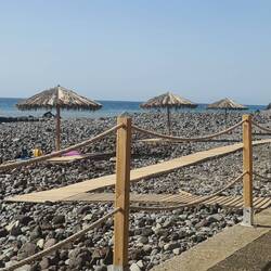 Unten am Strand empfängt mich ein ganz mildes Klima, da die kleine Bucht von beiden Seiten durch Felsen geschützt ist. Es ist nicht viel los, eine Handvoll Menschen, die am Strand sitzen oder in der Strandbar. Alles ist super hergerichtet. Es gibt Toiletten, Strandduschen, Liegen unter Sonnenschirmen, die man mieten kann, sowie eine entzückende Bar, mit Schirmen aus Bananenblättern.