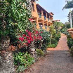 Die Anmeldung ging daher zügig. Dann standen wir da, mit unserem Schlüssel und mussten Haus und Zimmer finden. "Die Straße hinauf, bis zum übernächste Gebäude.", sagte der Rezepionist. Die Verständigungssprache ist Englisch. Das versteht hier scheinbar jeder. Das Hotel besteht aus 6 dreistöckigen Häusern, die auf Grund der örtlichen Begebenheit Terrassen förmig über einander gebaut wurden und mit einer schönen Gartenanlage verbunden sind. Aber erst einmal hieß es die schweren Koffer die steile Straße hinaufzuziehen, sie eine Treppe bis zum Hauseingang und dann in den 3 Stock zu schleppen.