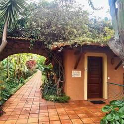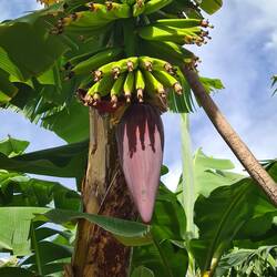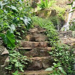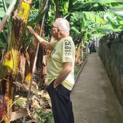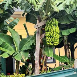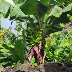 Wir parken dieses Mal am Straßenrand, denn wir wissen, dass es hier einen Wanderweg durch die Bananenplantage gibt. Etwas versteckt zwischen zwei Hausmauern weist ein Schild auf den Wanderweg hin, der uns kreuz und quer durch die Bananenplantage führt und Bananen in verschiedenen Reifegraden zeigt. Wir erfahren auch, dass die Banane nicht an einem Baum wächst, sondern eine Staude ist, auch wenn das mit dem aus gerollten Bananenblättern entstandenen und bis zu 6 m hohen Stamm so aussieht. Während der Wachstumsphase legen sich die älteren Blätter umeinander und bilden so einen Scheinstamm. Im Laufe der Zeit sieht die Pflanze einer Palme immer ähnlicher. Nach etwa sechs Monaten bildet die Pflanze den Blütenstand aus. Neben einer großen, meist roten männlichen Blüte gibt es zahlreiche gelbe oder weiße weibliche Blüten. Aus ihnen entstehen die Früchte, auch Finger genannt. Während der Wachstumsphase biegen sich die Finger nach oben, was die typische Krümmung der Banane zur Folge hat. Nach etwa einem bis eineinhalb Jahren können die Bananen geerntet werden. Bananenpflanzen tragen nur einmal in ihrem Leben Früchte. Wirklich interessant, das alles mal hautnah zu sehen. Und gegen einen kleinen Obolus kann man die Bananen gleich vor Ort verkosten. Die Bananenanpflanzungen ziehen sich weit am Berg hinauf. Es ist so steil, dass wir uns fragen, wie man da überhaupt noch arbeiten bzw. ernten kann.