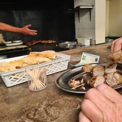 Die Bars, Cafés und Läden verkaufen alle Wasser und haben sich mit 3,90€ für den halben Liter abgesprochen. Den Durst mit Bier zu löschen, wäre ungleich günstiger. Da kriegt man die Halbliter-Dose schon für einen Euro. Was soll's, ich hab Hunger und Durst.