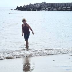 Den Versuch eines Strandspaziergangs gebe ich nach einigen Schritten auf. Bei diesen groben und großen Steinen muss man ganz genau aufpassen, wohin man tritt. Aber Hinsetzen geht.... für eine kurze Zeit.