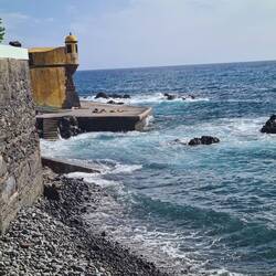 Wir fahren durch das am Berg liegende Örtchen bis hinunter zum neu gestalteten Strand und sind sehr erstaunt, gelben Sand vorzufinden. Für den künstlichen Strand und für ihren weißen Rum ist Calheta, eine der ältesten Städte der Insel, bekannt. Wir stellen das Auto ab und gehen an den Strand, der durch vorgelagerte Wellenbrecher vor den heftigen Atlantikwellen geschützt ist.