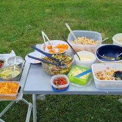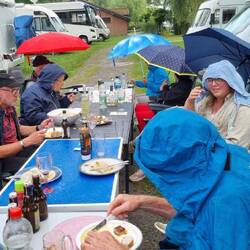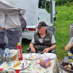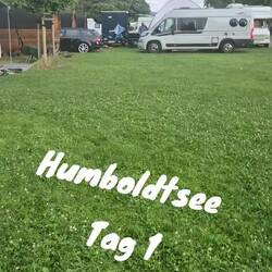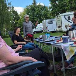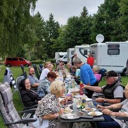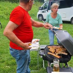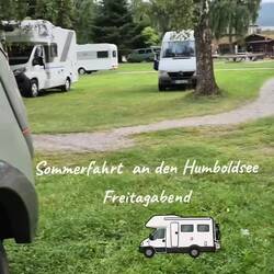 Um kurz vor sechs erreichen wir den Stellplatz am Humboldsee – perfekt getimt zum Grillabend. Die Gruppe ist schon mittendrin im Grillvergnügen. Also schnell Tisch und Stühle raus, Salat und Grillgut ausgeladen – und los geht’s. Begrüßung mit herzlichem Hallo, ein paar Neuigkeiten ausgetauscht, dazu das üppige Beilagenbuffet – jeder hat wieder etwas mitgebracht, und Helmut steht wie gewohnt am Grill und grillt für alle Fleisch oder Würstchen.