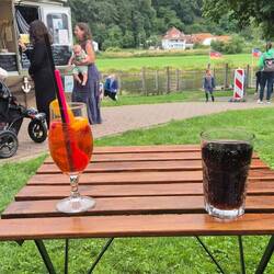 „Davon war nichts angesagt!“, ruft jemand, während der Regen fröhlich Wein und Bier verwässert. In Windeseile werden Schirme geholt und dann wird weiter gegessen.