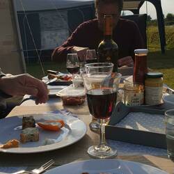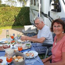 Michael und ich fahren später mit dem Roller nach Ulft. Dort wollen wir uns ein wenig schlau machen, denn in Ulft soll am Wochenende auf der Oude Ijssel das Flüsterboort ablegen. Zwei Stunden schippert es mit seinen Passagieren über die Oude Ijssel und durch das Naturschutzgebiet. Auf Google Maps ist allerdings kein Anleger an der Ijssel zu erkennen. Irgendwo im oder am DRU Industriepark soll das sein. Wie umrunden mit dem Roller zwei Mal Ulf, bis wir endlich den Industrie Park finden. Es ist eine alte Eisengießerei, die zum Industrie Denkmal erklärt worden ist. In ihrem Innern haben Gastronomie, Museen und Läden Platz gefunden ( https://www.dru-industriepark.nl/de/dru-industr…) Dort direkt an einer Holzbrücke, die den Industriepark mit der anderen Ijsselseite verbindet, finden wir auch die Anlegestelle des Ausflugsbootes, das am Samstag und Sonntag um 13.00 Uhr ablegt. Tickets dafür kann man online buchen. Wir belohnen uns für unsere Suche mit einem Besuch im dortigen Biergarten, denn heute sind unsere Freunde für das Abendessen zuständig. So können wir uns Zeit für das Industriedenkmal lassen, bevor wir zurück zum Stellplatz fahren Dort erwartet uns schon ein schön gedeckter Tisch am See Wir brauchen nur noch Platz nehmen und uns verwöhnen lassen. Natürlich gibt es auch an diesem Abend einen grandiosen Sonnenuntergang.Read more