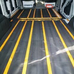 Anschließend machen wir uns an die Verlattung für die Bodenplatten, die auf dem Boden festgeschraubt und geklebt werden. Zwischen die Verlattung kommt auch ordentlich Dämmung. An den Wänden machen wir die Verlattung nur punktuell, wo Möbel hinkommen, um im Innenraum Platz zu sparen. Wir messen alles aus und fertigen eine Zeichnung für später an. Wenn die Wände drüber sind sieht man ja nichts mehr. 😄