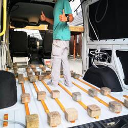 Sechs Batterien sind im Auto verbaut. Eine Starterbatterie und eine Aufbaubatterie, die mit einem Schalter die Starterbatterie überbrückt, falls diese mal leer sein sollte. Desweiteren haben wir vier AGM Batterien je 80Ah unter den Fahrer- und Beifahrersitz gebaut. Diese sind für die Speisung der Elektrizität im Wohnraum. Bei einer Belastung von 65 Watt pro Stunde sollten die Batterien bei voller Belastung ca. 32 Stunden halten, falls keine Sonne vorhanden ist und wir mit Sprinti nur stehen. Aber auch wenn man mal keine Sonne sieht, laden sich die Batterien aber trotzdem fix auf. 😊