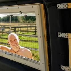 Danach kommen die Hintertüren dran. Dort waren keine Fenster, aber morgens direkt aus dem Bett in die Natur zu schauen hat uns beim Reisen so gut gefallen, das auf jeden Fall welche rein sollten. Hier fiel die Wahl auf die größtmöglichen Fenster, also Originale. 😊