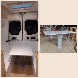 Den Hubtisch haben wir erhöht, so dass man vernünftig drunter sitzen kann und die Ecken des Tisches abgerundet, lackiert und fertig. Später würden wir hier vielleicht noch anderes schönes Holz nehmen, aber das Holz war noch über. 😄 Die Tischplatte kann man anhand eines Hebels ganz leicht nach unten und oben auf die gewünschte Position bewegen.