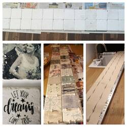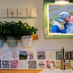 Die Fliesen zu gestalten hat richtig Spaß gemacht. Das habe ich immer zwischendurch gemacht. Mit einem speziellen Kleber kann man Fotos, Servietten oder andere Papiere auf die Fliesen anbringen. Nach einer Stunde ist es übertragen. Mit einem Schwämmchen und Wasser wird das Papier dann abgerubbelt. Je nachdem welchen Effekt man haben möchte, kann man das Bild dann bearbeiten. Die Wahl fiel auf weiße Natursteinfliesen und quasi einen Vintageeffekt. Also habe ich viel mit dem Schwamm weggerubbelt und ausprobiert. Das Ergebnis wird immer anders. 😊 Anschließend werden die Fliesen zweimal mit besonderem Versiegelungslack gestrichen, damit die Bilder halten wenn verputzt wird oder Wasser dran spritzt. Immer zwischendurch den Lack einen Tag trocknen lassen. Fertig! Die Fliesen haben wir auf einer Sperrholzplatte mit speziellen Montagekleber festgeklebt, genau wie die silberne Fliesenkante, die Sven mit der Flex passend gemacht hat. 😉 Das Ganze haben wir dann ebenfalls mit Montagekleber an die Wand angebracht. 😊 Da die Wand nicht ganz gerade ist, was der Sprinter so mit sich bringt, war das denke ich eine gute Lösung. Jens hat dann verfugt und ich reichlich geputzt. 😄 Auch das Silikon hat Jens überall im Camper schön ordentlich gemacht. Er hat da ein Händchen für. 👌😘