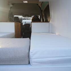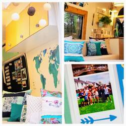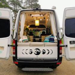 Auch die Bezüge, Vorhänge, kleine Aufbewahrungsbeutel, Sitzkissen und wundervolle Yogakissen stammen von ihr und verschönern den Sprinter sehr.