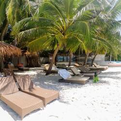 Die Beachvillas haben alle einen eigenen Strand mit Hängematte und Liegen, wo man durch wachsende Palmen nicht reinschauen kann. 👌 Hier könnte man es ein paar Tage aushalten. 😄 Ein Wasserbungalow oder eine Beachvilla kostet 600-800 Euro am Tag. Der Tagesbesuch für uns zwei 100 Dollar für vier Stunden. Das ist so mittel vom Preisniveau auf den Malediven. Gibt noch viiiel teurere. 😅