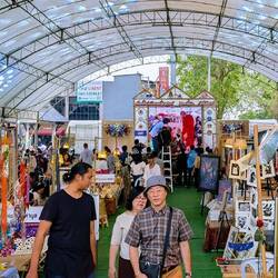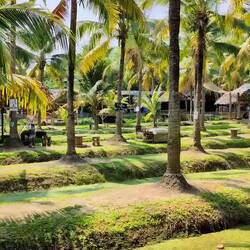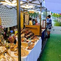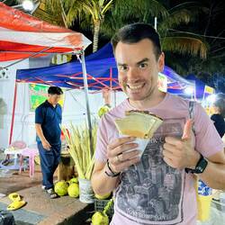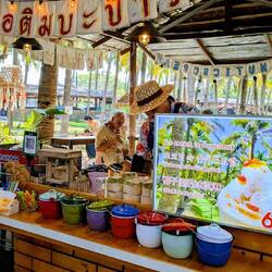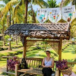 Nachdem wir heute Morgen einige organisatorische Dinge abgearbeitet hatten, haben wir uns auf den Weg zum📍„Coconut Market“ gemacht. Dieser liegt am Stadtrand von Chiang Mai und befindet sich inmitten einer Kokosnuss-Plantage (Reihen mit Kokosnuss-Palmen mit Wasserreservoirs dazwischen und durch Brücken verbunden). Dort gibt es viele kleine Stände, die Kleidung 👚👖 und Essen 🍛 verkaufen. Selbstverständlich kann man dort auch viele Kokosnuss-Produkte zu sich nehmen. Wir haben das Kokosnuss-Eis 🥥🍦, einen Kokosnuss-Milchshake 🥥🥤 und Kokosnuss-Plätzchen 🥥🍪 probiert. Ein Traum! Die Plantage ist sehr hübsch gestaltet und lädt zum Verweilen ein. 🧡