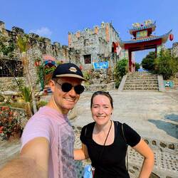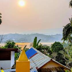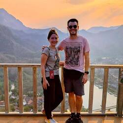 Nach einem kurzen Fußmarsch 🦶erreichten wir unsere Unterkunft für die nächsten vier Tage, erneut mit Blick auf einen Fluss 🏞️ - den Nam Ou - dann kühlten wir uns mit einem Kaltgetränk 🍻 auf der Veranda vor unserem Zimmer ab (was muss das muss 😉). Nach einer erfrischenden Dusche 🚿 und einer kurzen Pause 💤 brachen wir auf zu dem ersten Highlight in Nong Khiaw. Dem 📍Som Nang View Point. Dieser liegt auf der uns gegenüberliegenden Flussseite auf ca. 500 m. Ein schmaler steiler treppenreicher Weg führt nach oben auf die zwei Aussichtsplattformen. Wir kamen rechtzeitig zum Sonnenuntergang 🌄 an und konnten diesen bei einem Sundowner Getränk genießen. 🥂 Da gerade Nebensaison ist, war es zum Glück nicht so voll wie auf vielen Bildern, die wir im Vorhinein gesehen hatten.