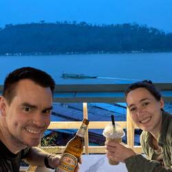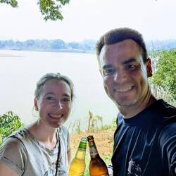 Sobald die Einreise erfolgreich vollbracht war 🛂✅ nahmen wir uns 5️⃣ ein Songthaew, das uns direkt zu unserem Hotel 🛎️ in Ban Houayxay brachte. Wir bezogen unser Zimmer und genossen dann erst mal ein kaltes Getränk auf der Terasse am Mekong. 🍻 Dort werden wir unsere erste Nacht in Laos verbringen bevor es dann morgen auf den Mekong in Richtung Luang Prabang geht.