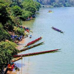 Das Highlight des Tages waren die alljährlichen Boot-Rennen 🛶 auf dem Nam Ou River. Man kann den Sport wohl am ehesten mit Rudern vergleichen. Ein Team besteht aus guten 30 Personen. Teams aus den umliegenden Dörfern treten gegeneinander an. 🔄 Die Stimmung am Ufer (aber auch im ganzen Dorf) war bombastisch. 🥳 Überall Menschen. Überall laute Musik. Alle feuerten ihre Teams an. Wir gesellten uns zu den Laoten und schauten dem Treiben zu. Wie sollte es anders sein: Nong Khiaw hat gewonnen (so wurde es uns zumindest gesagt 😉). Nach dem letzen Rennen leerte sich Nong Khiaw allmählich. Leider ist viel Müll zurück geblieben… Jetzt schallt nur noch der Karaoke Gesang 🎤 durch die Gassen.