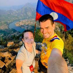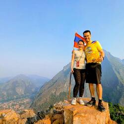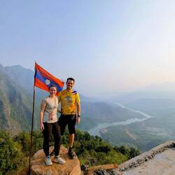 Oben angekommen erwartete uns ein phänomenaler Blick. 😍 Es ist kaum in Worte zu fassen. Weit und breit Berge. Unten am Bergfuß Nong Khiaw. Das kleine Dorf am Nam Ou River. 🏞️ Zuerst war zu Beginn noch eine Gruppe oben, die dort übernachtet hatte. Anschließend waren wir ganz alleine. Es war soooo toll!