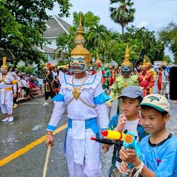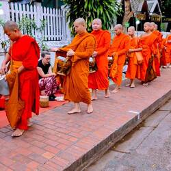 Neben vielen Mönchen der verschiedenen Tempel 🛕in Luang Prabang haben kleinere und größere Gruppen teil genommen. Man kann die Parade am ehesten mit einem Fastnachtsumzug vergleichen aber anstatt Süßigkeiten fliegt hier unterbrochen Wasser durch die Luft.