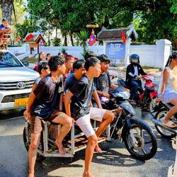 Heute war der erste „große“ Tag des Laotischen Neujahrsfestes - Bin Pi Mai. 🎉 Auf den Straßen in Luang Prabang war bereits sehr viel los. Viele Autos 🚙, viele Roller 🛵, viele Menschen. Das „water splashing“ (Wasserspritzen) 💦 hatte bereits begonnen. Dies ist Tradition und wir gemacht um das Alte aus dem vergangenen Jahr abzuwaschen um frisch für das neue Jahr zu sein. Dies wird wirklich sehr ausgiebig zelebriert. Egal ob mit dem Gartenschlauch, Eimern oder Wasserpistolen. Es gelingt kaum trocken durch die Straßen zu kommen.