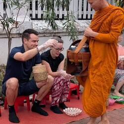 Heute Morgen hat für uns der Wecker ⏰ bereits um 5 Uhr geklingelt. Hier in Luang Prabang wird jeden Morgen um 6 Uhr ein großer 📍Almosengang der Mönche prozessiert. Daran wollten wir unbedingt mal teilnehmen. Also hieß es früh raus aus den Federn und ab Richtung „Main Street“. 💨 Dort angekommen kauften wir ein paar Gaben (Kekse 🍪 und Reis 🍚), setzten uns an den Straßenrand und warteten auf die Mönche. Es dauert nicht lang bis die ersten Mönche an uns vorbei kamen. Das war ein sehr besonderes Erlebnis. Wenn leider mittlerweile auch Recht touristisch.