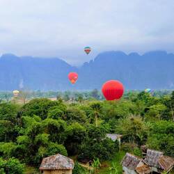 Eine ganz besondere Aktivität, für die Vang Vieng bekannt ist 🏅, ist der Flug mit einem Heißluftballon 🔥🎈. Als wir heute Morgen den Vorhang hinter unseren Betten aufgezogen haben, konnten wir beobachten, wie einige gerade auf der anderen Flussseite landeten. Es ist wirklich sehr beeindruckend die Heißluftballons vor so einer tollen Berg-Kulisse fliegen zu sehen. 😍