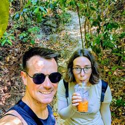 Der Weg führte durch eine Kautschuk-Plantage* 🌳🛞, in der noch heute aktiv Latex (-Saft) gewonnen wird. Das war wirklich sehr beeindruckend. Der Weg war gut ausgebaut und hat recht flach angefangen ➡️, ist dann aber schnell steiler geworden ↗️. An den besonders steilen Stelle waren Seile 🪢 gespannt um sich daran hoch ziehen zu können. Wir sind ganz schön ins Schwitzen gekommen. 🥵 Auch die hohe Luftfeuchtigkeit heute hat seinen Teil dazu beigetragen. 🧖🏻 Nach einer guten Stunde sind wir oben angekommen 💪, an der verlassenen 📍Jungle Bar und dem 📍View Point. Auch hier machte sich die hohe Luftfeuchtigkeit bemerkbar. Die Brille von Svenja war beschlagen. 🧖🏼♀️ Nach ein paar Bildern 📸 und Videos 📹 ging es auf der anderen Seite des Berges wieder runter ⬇️. Dieser Weg war recht schmal und dschungelig aber gut gehbar. Auch hier ging es an vielen Stellen durch Kautschuk-Plantagen 🌳🛞.
