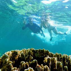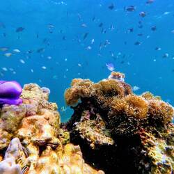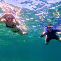 Wir waren einige Stunden dort. Zwischen drin waren wir mal im Wasser zum Schnorcheln 🤿. Das war dort direkt vom Strand aus möglich. Wir haben einige Fische gesehen 🐟🐠🌈🐟, blaue Seesterne 💦⭐️, Seeigel 💦🦔 und Korallen 🪸 gesehen. Toll war’s. 😍