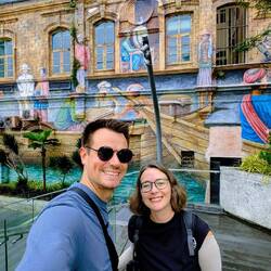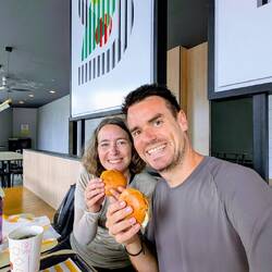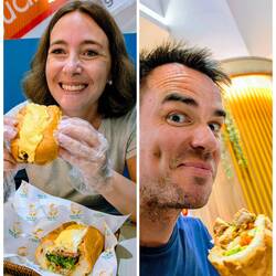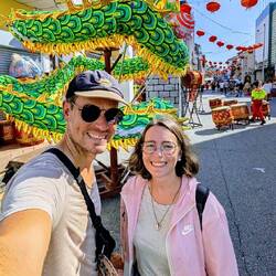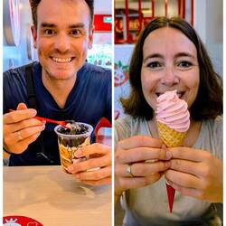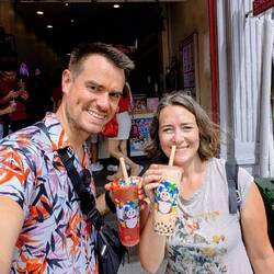 Wir haben uns dann erstmal ein Mittagessen bei McDonald's gegönnt 🍔🍟 (für Svenja gab es einen warmen Tee - hier sind es nämlich „nur“ um die 20 Grad) und sehr leckere lokale Erdbeeren 🍓 und sind durch die Geschäfte geschlendert. Wir haben dort wieder einige tolle Bilder 🖼️ entdeckt. Langsam war die Kleidung auch wieder trocken. Für den Rückweg haben wir uns dann lieber ein Taxi 🚖 geholt um uns nicht komplett zu verausgaben.