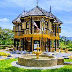 Kaum in Kuala Kangsar angekommen ging es auch schon auf Erkundungstour. Zu Fuß 👣 machten wir uns auf den Weg zum Staatsmuseum, 📍Istana Kenangan, dem ehemaligen aus Holz gefertigten Palast des Sultans. Der aktuelle Palast des Sultans, 📍Istana Iskandariah, liegt direkt daneben. Leider konnten wir diesen nur von außen bestaunen. Ein Stück weiter liegt die 📍Ubudiah-Moschee. Sie wurde 1️⃣9️⃣1️⃣3️⃣ erbaut und gehört mit ihren goldenen Kuppeln 🕌💛 zu den schönsten Malaysias. Die drei Gebäude waren sehr beeindruckend. 🤩