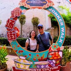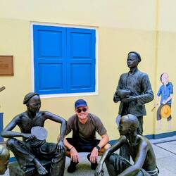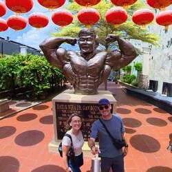 Auf dem Rückweg zu unserer Unterkunft sind wir die 📍Joker Street (früher hat hier die 2. Klasse der Chinesen 🇨🇳 gewohnt) entlang geschlendert, mit vielen kleinen Geschäften. Zur Stärkung gab es ein Chicken Bred (Brötchen gefüllt mit Curry-Chicken) und ein Eis beim Mixue. Ein Bild mit „The father of bodybuilders in Malaysia“ 💪 im 📍Jonker Walk World Heritage Park durfte natürlich nicht fehlen.