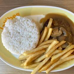 Für Svenja gab es ihr deutsches 🇩🇪 und philippinisches 🇵🇭 Lieblingsessen ♥️🍽️: „Frikadelle“ mit Pilzrahmsoße auf Reis und Pommes.